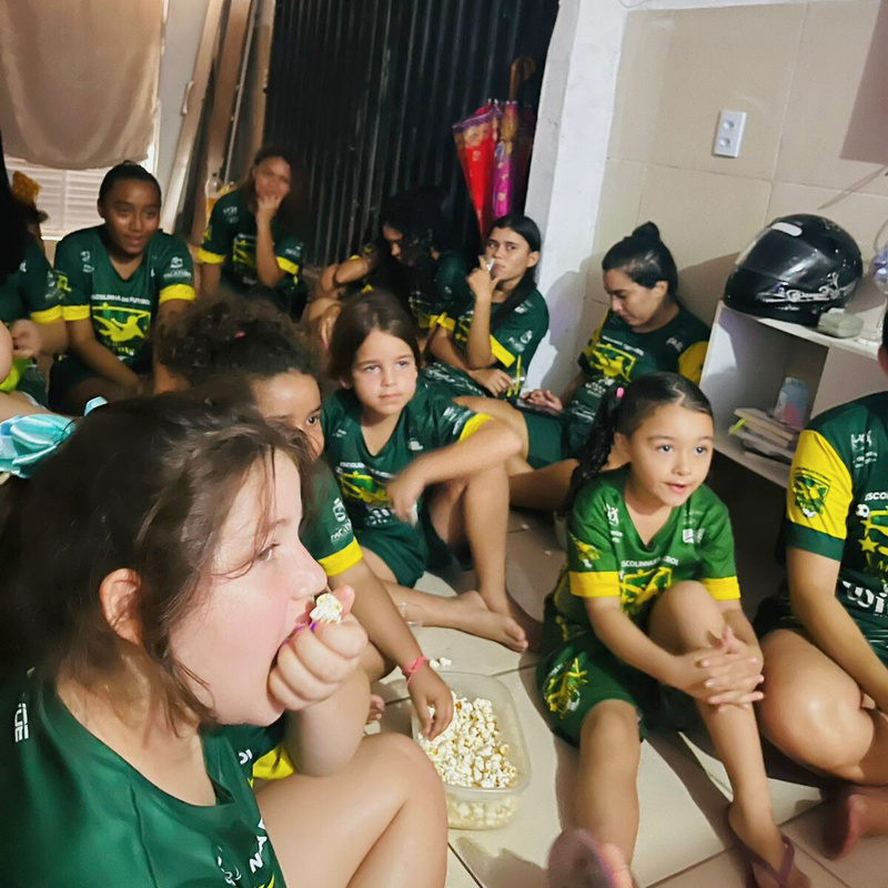 Ainda assim, o filme trouxe também reflexões importantes sobre a força, a coragem e a persistência feminina dentro do esporte, servindo como aprendizado e inspiração para as alunas. Ao final da aula, a equipe técnica da Escolinha organizou um momento com lanches como cachorro quente, pipoca e refrigerante, para encerrar a aula em clima de alegria e carinho.