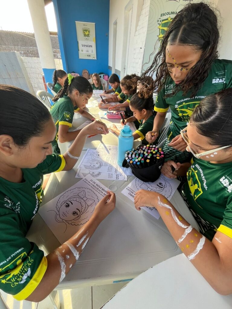 Na última semana, a sede de Itaitinga (CE) da Escolinha de Futebol Meninas Campeãs celebrou o feriado da Consciência Negra. As alunas realizaram pinturas corporais e pinturas em papel, inspiradas em diversos elementos culturais, exaltando suas próprias raízes. Em um momento especial de troca de experiências, conscientização e ludicidade, as meninas participaram de forma ativa, aprendendo por meio da expressão artística e do diálogo.